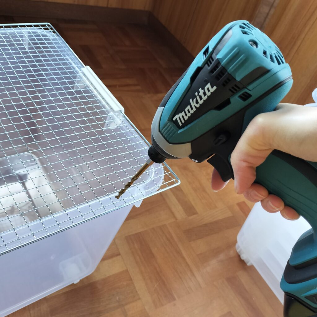 網と衣装ケースをとめるため、ダイソーの結束バンドを使用しています。